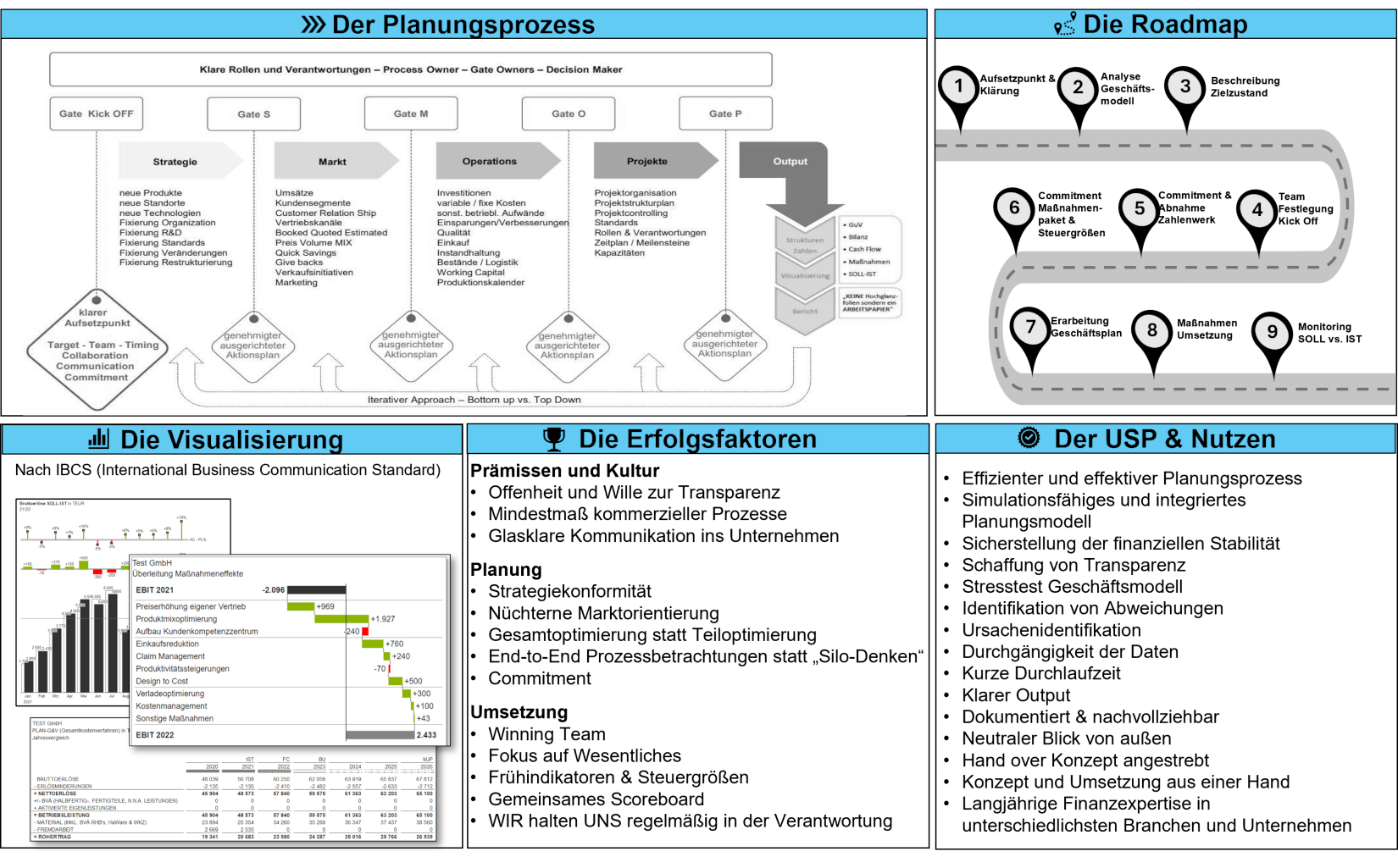 Mit einem voll belastbaren, strategiekonformen Zahlenwerk (Planung, Berichts- wesen, KPI‘s), synchronisiert mit einer wirksamen Maßnahmenergreifung, bereiten wir das Fundament für eine unschlagbare Transparenz auf. Wir bilden dabei das Geschäftsmodell Ihres Unternehmens in seinem wesentlichen Kern ab und stellen sicher, dass die ausschlaggebenden Erfolgshebel erkannt und getrackt werden.